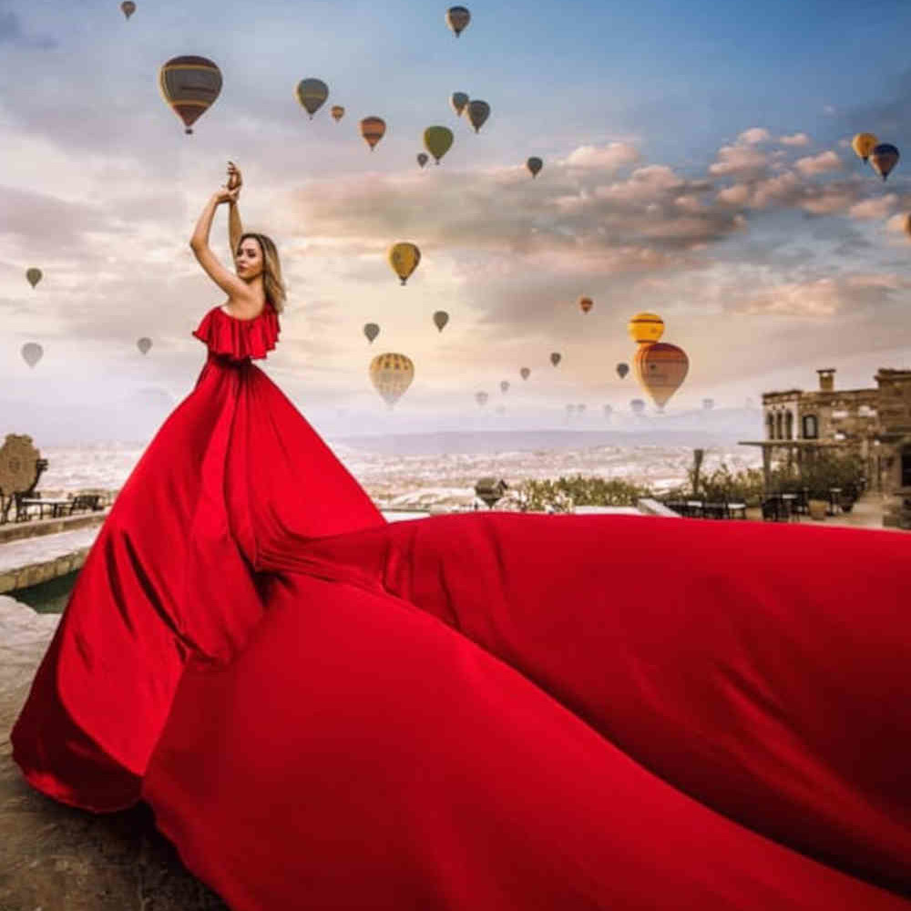 Experience the enchantment of Cappadocia with a Flying Dresses photoshoot. This unique opportunity lets you capture stunning photographs in a vibrant, flowing gown against Cappadocia's dramatic landscape. Each dress is designed to billow beautifully in the wind, creating a magical, unforgettable scene.